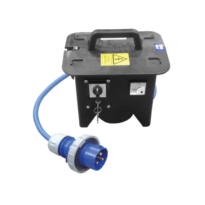 The Residual Current Circuit Breaker (RCCB) Unit should be plugged in either to the fixed supply or to the generator via its 2m lead. This unit should be mounted securely above ground level if possible. If not then it should be stood on the floor/ground in a position where it is unlikely to be damaged and firmly held down with sandbags or weights so that it cannot be knocked over.