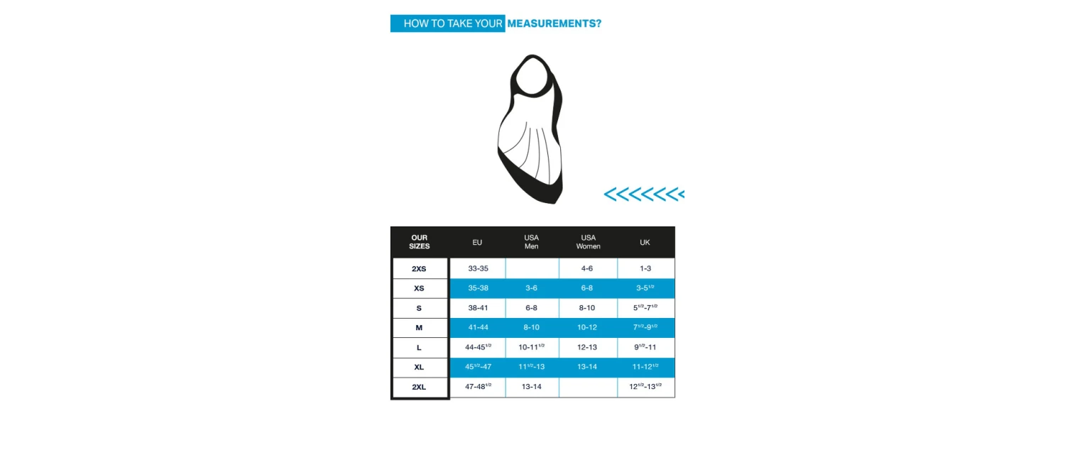 | Size | 2XS – UK 1-3/EU 33-35, X Small – UK 3-5.5/ EU 35-38, Small – UK 5.5-7.5/ EU 38-41, Medium – UK 7.5-9.5/ EU 41-44, Large – UK 9.5-11/ EU 44-45.5, X Large – UK 11-12.5/ EU 45.5-47, XX Large – UK 12.5-13.5/ EU 47-48.5 |