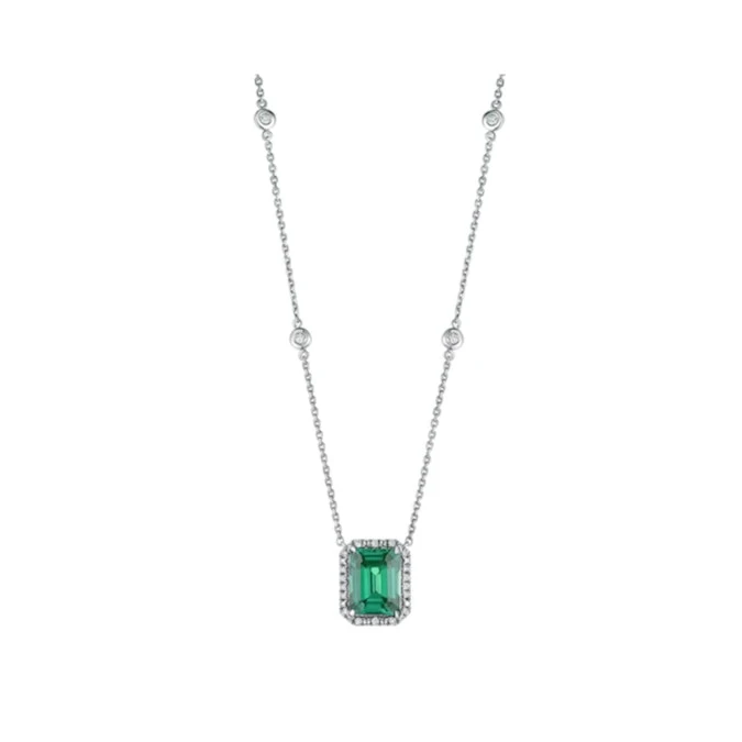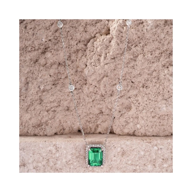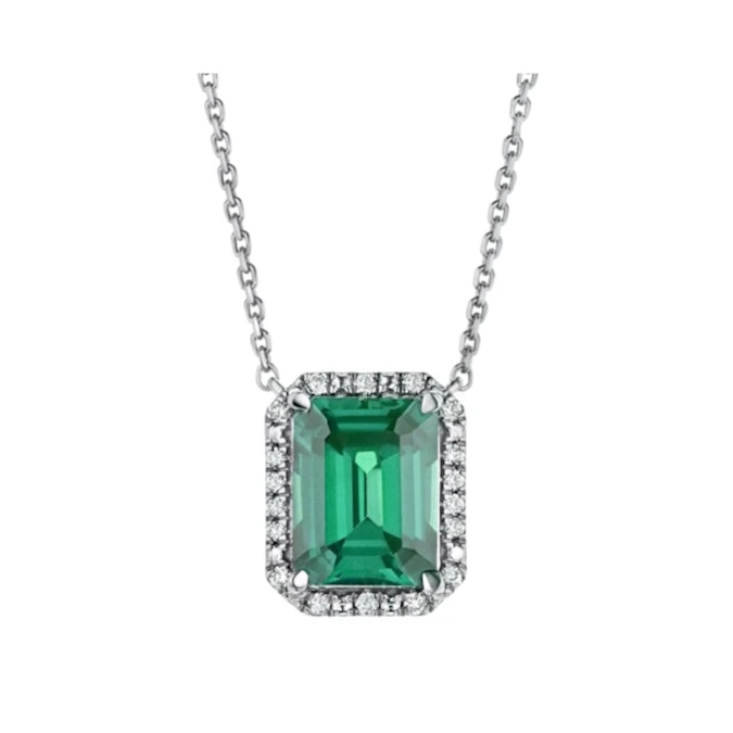 Explore the beauty of the Astra Lab Emerald and Diamond Halo Octagon Cut Necklace. The delicate sterling silver chain is interspersed with subtle, encapsulated diamonds, adding extra intrigue to a classic piece. The beautiful 1.50ct lab grown emerald sits within a halo of 0.16ct of H/SI consciously crafted diamonds, which creates beautiful sparkle with every movement of the wearer. The classic Art Deco octagon cut of the main stone makes this piece a timeless present for a loved one, or even as a perfect self-gift. Benefit from free worldwide delivery, sleek packaging a 5-year guarantee with The Diamond Store.