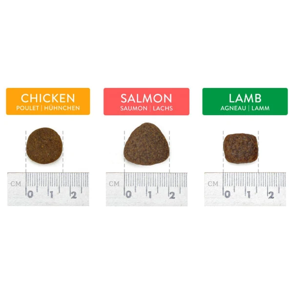 Composition: Fresh salmon (42%), sweet potato (14%), dehydrated salmon (13%), peas (7%), apple pulp (6.5%), hydrolyzed salmon (5%), dehydrated carrot (0.32% equivalent to 3% carrots), dehydrated cranberry (0.8% equivalent to 0.75% cranberries), chicken fat, pea protein, brewer’s yeast, minerals, chicory (source of fos), mannan-oligosaccharides (mos), camomile, parsley, rosehips, sea algae, rosemary, cloves, glucosamine (350 mg/kg), cartilage (a source of chondroitin 250 mg/kg), yucca schidigera.