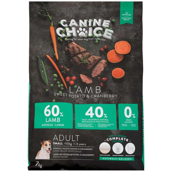Canine Choice Adult Small is a complete grain-free dry food for small-sized dogs under 10 kg. It has a high proportion of meat (60%). Small dog breeds burn energy much faster than larger dogs, which is why they require a nutrient-dense food that is rich in protein and can be fed regularly in small portions. The small, crunchy croquettes are designed for smaller teeth and support oral hygiene. Kibble size can fluctuate between 10-15% on any batch production.