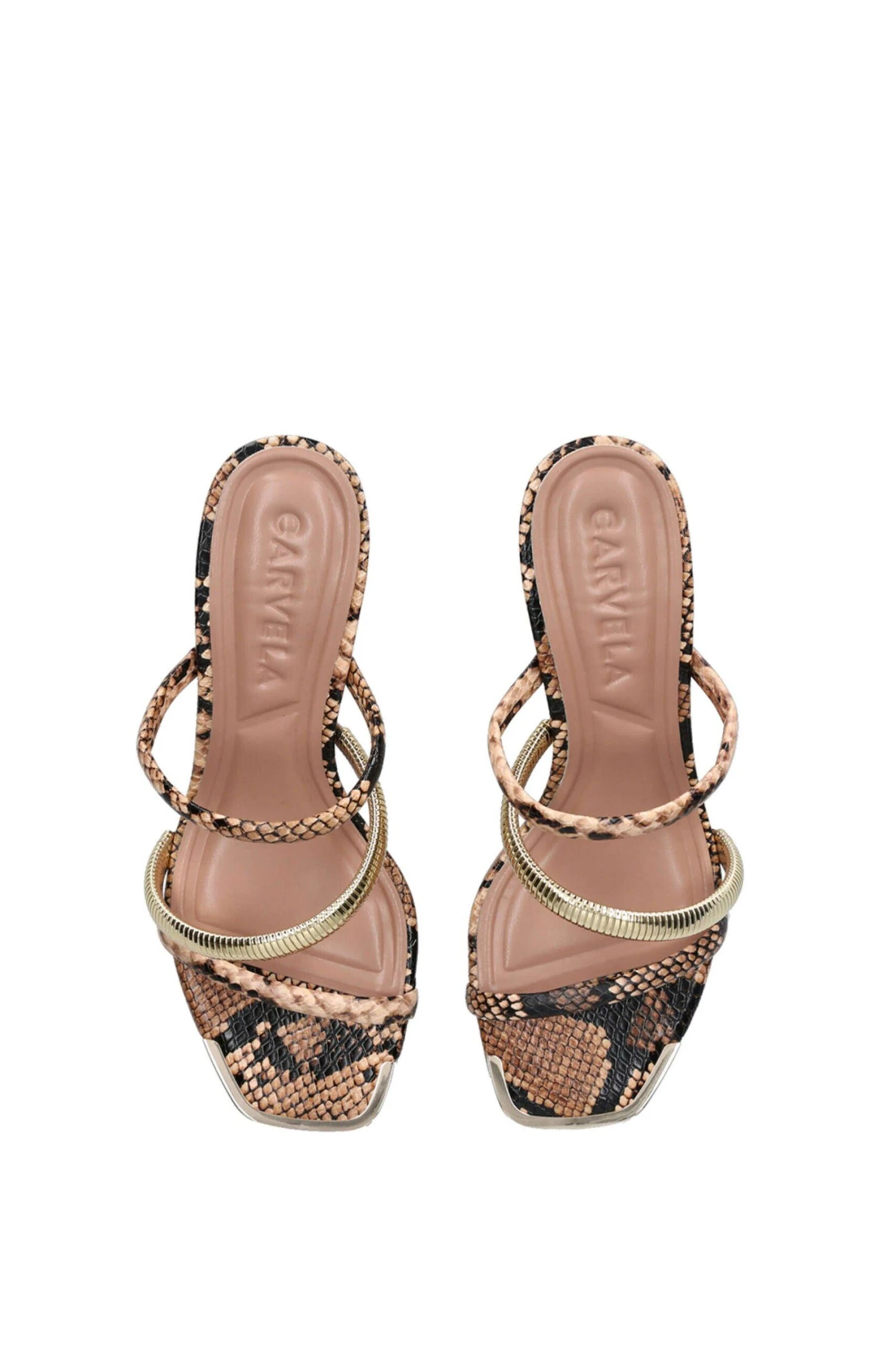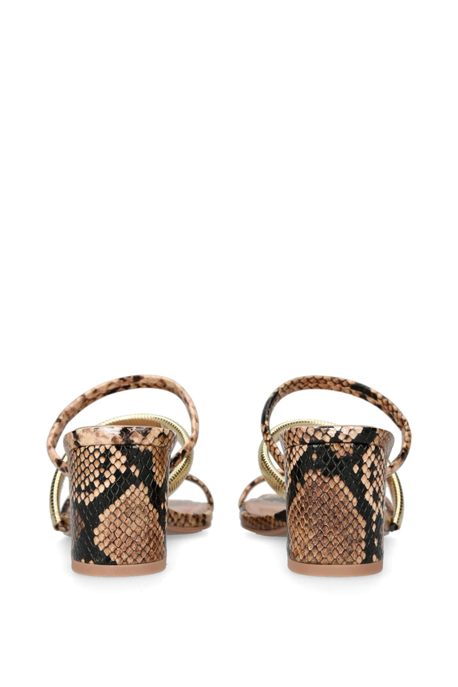 The Roma Block is a slip on heel which features a snake printed upper. There is one baguette gold tone strap over the foot corresponding with the gold toe cap.