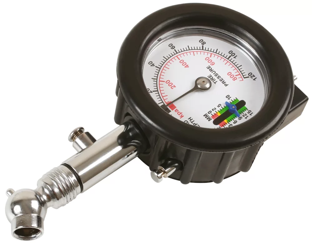Handy 2-in-1 gauge for measuring pressure and tread. Protective rubber body with long flexible reinforced hose. Suitable for car and commercial vehicles.