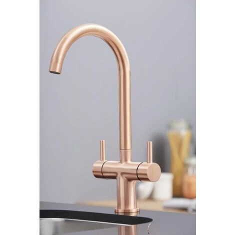 The SIA KT3CU is a swan neck kitchen mixer tap with a contemporary look that will add a touch of style to any kitchen. The stunning copper finish beautifully complements copper coloured sinks but also offers a daring contrast with other sinks. Try pairing this tap with a black composite sink to create a phenomenal focal point in your kitchen! The two quarter turn levers allow for precise water flow and the swivel spout means it is perfect for sinks with multiple bowls.Â